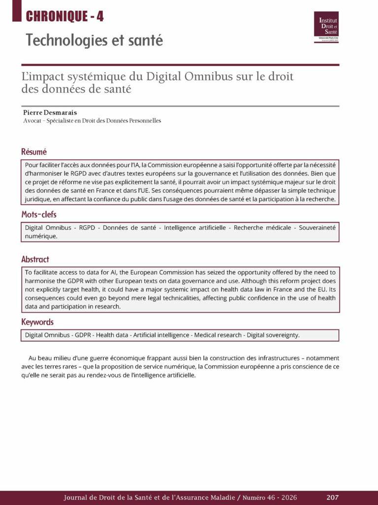 📖 P. Desmarais, « L’impact systémique du Digital Omnibus sur le droit des données de santé », JDSAM, n° 46, avril 2026.
