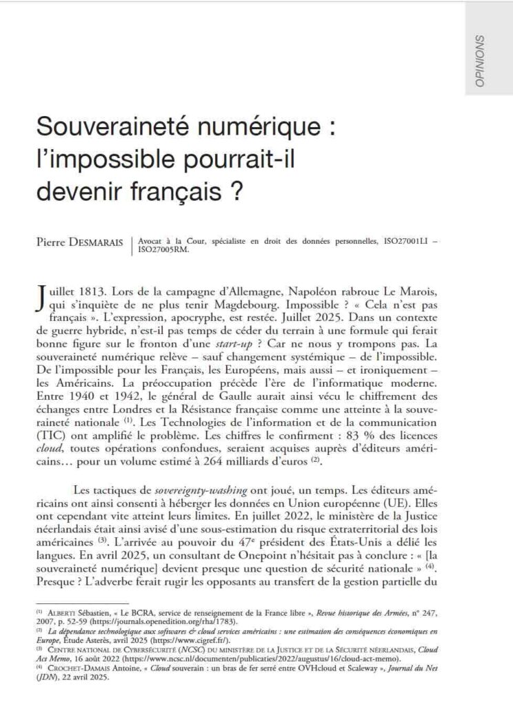 Mon article « Souveraineté numérique : l’impossible pourrait-il devenir français ? » vient de paraître dans la Revue Défense Nationale.